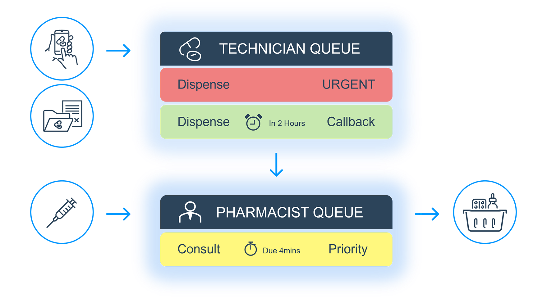 Worx creates virtual baskets consolidating multiple patients, all script types, consultations, appointments, and notes into a single, interactive reference tile. It's intuitive tagging, quick action buttons, and color-coded status indicators provide instant visibility of script wait times and target fulfillment times.